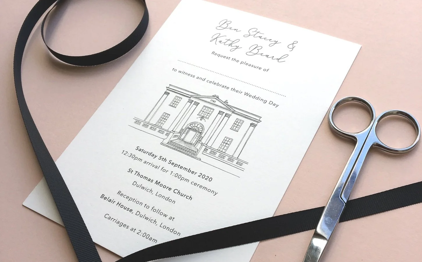 Designs featuring original artwork of the venue, scene or floral illustrations, printed on a textured or smooth paper stock 300gsm and paired with a matching white or brown kraft envelope