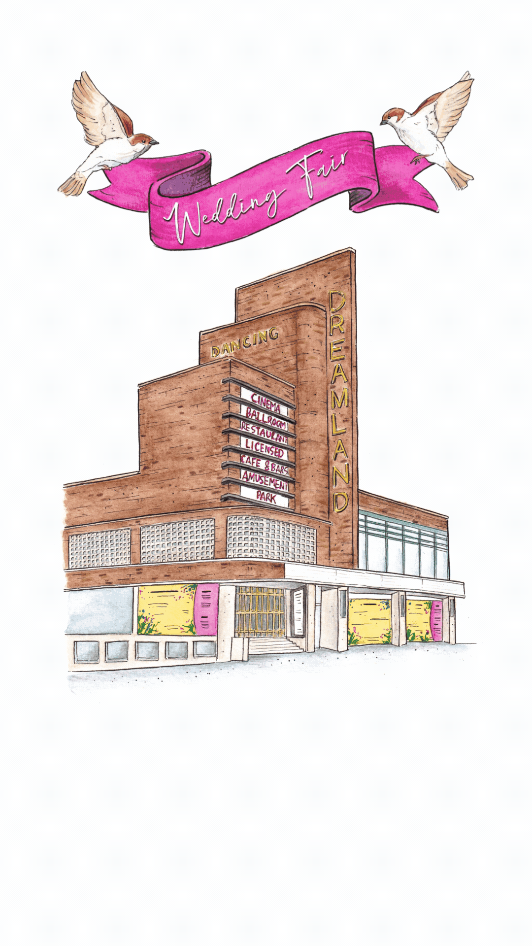 My process began as ever by studying the building, looking at reference and sketching.. I considered the different views of the venue, focusing on size, scale, and angles to inform the final composition. Given Dreamland's distinctive energy as a fun and vibrant wedding location, I knew the illustration should be in full colour, specifically the iconic yellow lettering and the brown brick tones that are so recognisable.
