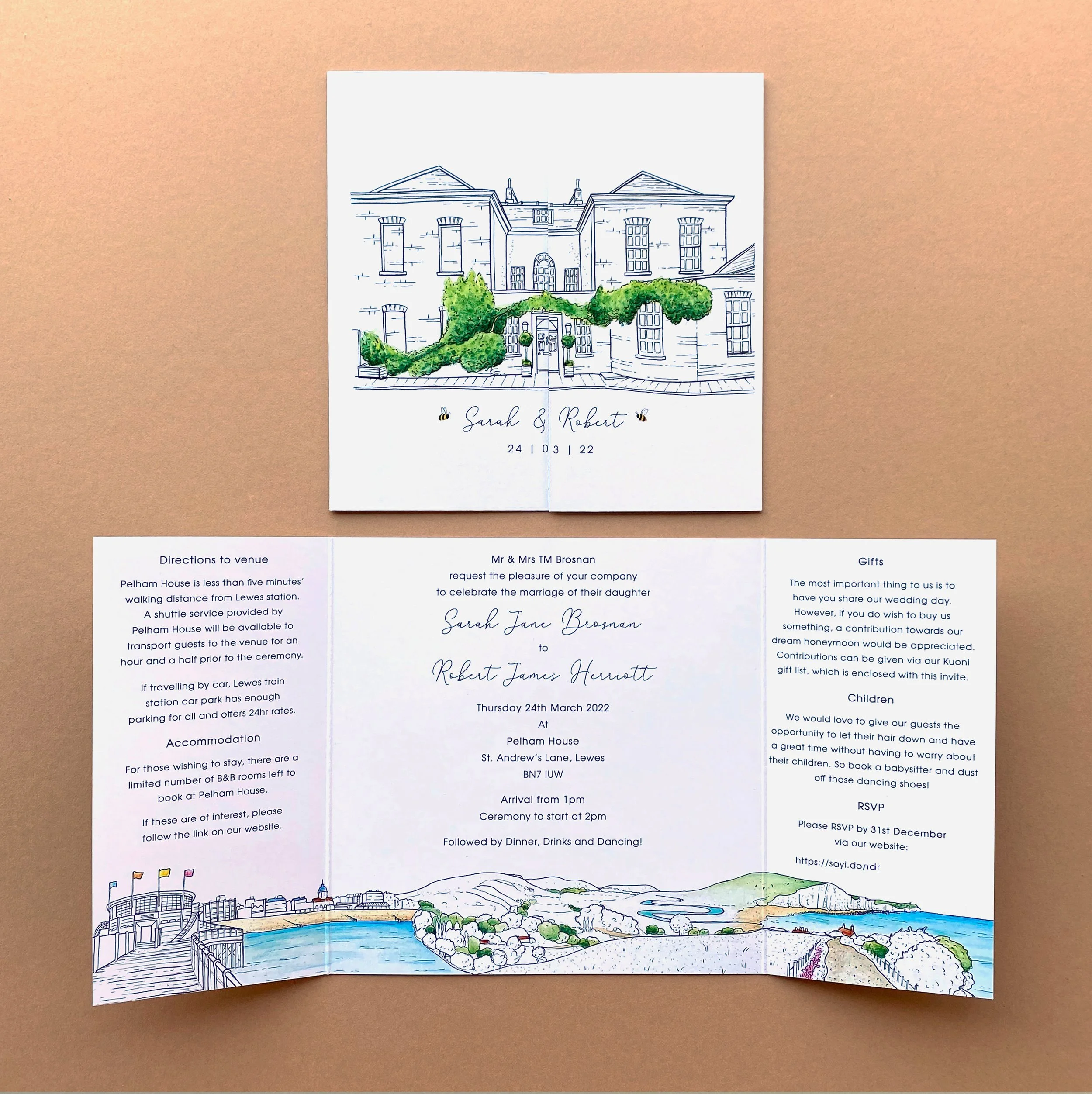 This is such a lovely venue; in fact, it’s one we even looked at when we were planning our own wedding before the pandemic and moving to Kent. It holds a special place in my memory, and I was excited to revisit it for this commission. I’d also previously illustrated Pelham House for a stationery commission—used on a save the date and invitation—so it was fun to revisit the architecture from a new perspective.